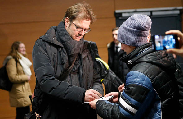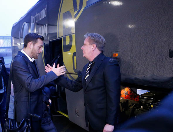 12 февраля в 16:07 по местному времени в донецком аэропорту им. Прокофьева приземлился самолет с внушительной делегацией из Дортмунда. В полете первую команду «Боруссии» сопровождали 20 журналистов и 80 представителей фан-клуба «черно-желтых». На первую встречу с «Шахтером» в рамках 1/8 Лиги чемпионов УЕФА главный тренер немцев Юрген Клопп взял следующих игроков: