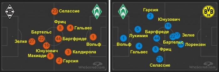 Усредненные позиции игроков «Вердера» против «Боруссии» из Менхенгладбаха (слева) и Дортмунда (справа). Заметно более высокое расположение Селассие (№23) по сравнению с Гарсией (№2) и синхронные позиции Баргфреде (№44) и Фрица (№8).