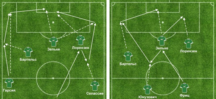 Основные варианты атак «Вердера». Слева – действия через связки фланговых защитников с нападающими. Рейды Юнузовича из глубины и длинные передачи в адрес Зельке – практически единственные варианты для быстрой доставки мяча в атаку (справа).